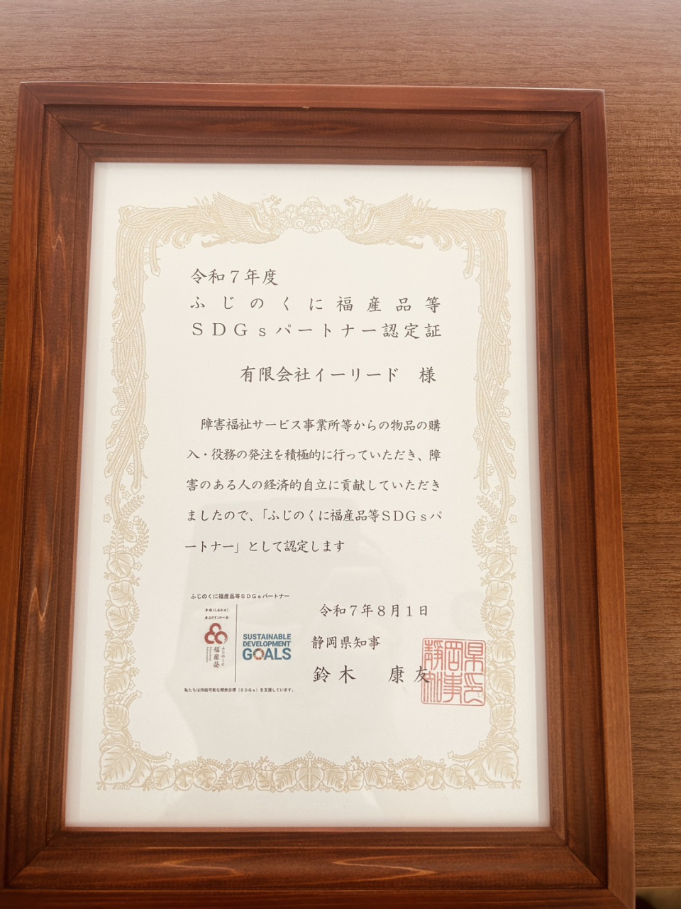 「ふじのくに福産品等 SDGs パートナー」は、静岡県が定める制度で、障がい者の就労支援を目的とした福産品の購入や、福祉サービス事業所への役務発注などを積極的に実施する企業・団体を、県が認定するものです。
